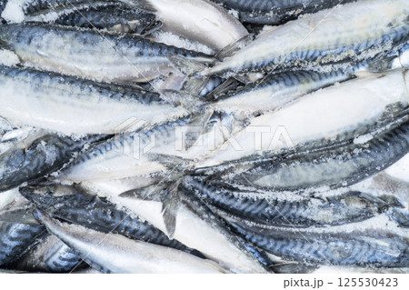 Frozen mackerel background. Frozen group of fish. Iced fish. Heap of mackerel. Mackerel pattern. Mackerel texture. Fish background