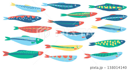 Fish textured set. Sardines school collection. Salmon silhouettes. Undersea animals. Vector hand drawn cutout collage elements illustration