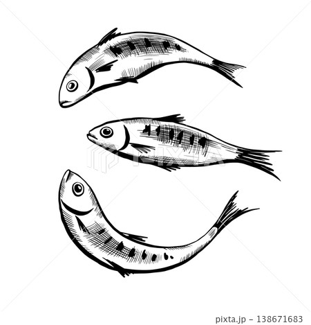 Sardine fish set in minimalist black and white vector line art. Three dynamic swimming fishes for eco-friendly apparel print, marine branding, organic seafood packaging and modern poster graphics