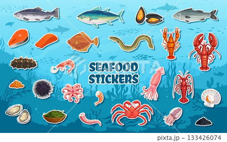 Cartoon seafood and fish stickers pack with vector tuna, trout, shellfish and lobster, crab shrimp, squid and octopus. Oyster and caviar, seaweed, eel, mussel and scallop seafood cartoon stickers