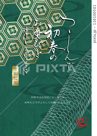 横向きの蛇と和柄のイラストの年賀状_謹賀新年_縦型_白