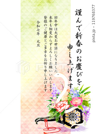2025年 巳年年賀状 白蛇と花車