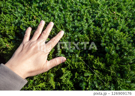 剪定したカイヅカイブキを触る
