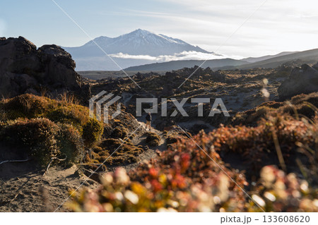 Hiker on rugged volcanic trail near Mount Ruapehu, Tongariro National Park, NZ