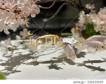 春の訪れを喜ぶ金魚たち 桜の花びらと影が織りなす水中のお花見