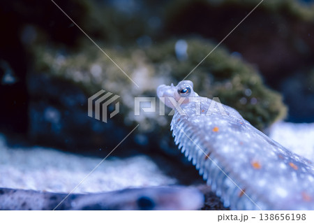 砂底に潜むカレイのクローズアップとオレンジ色の斑点