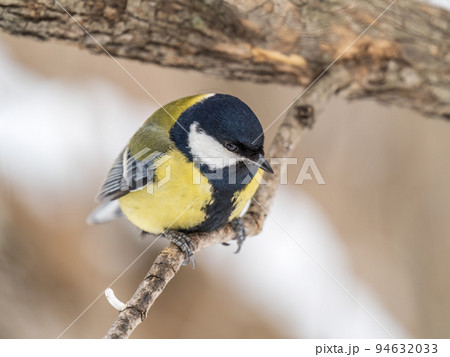 Cute bird Great tit, songbird sitting on a branch without leaves in the autumn or winter.