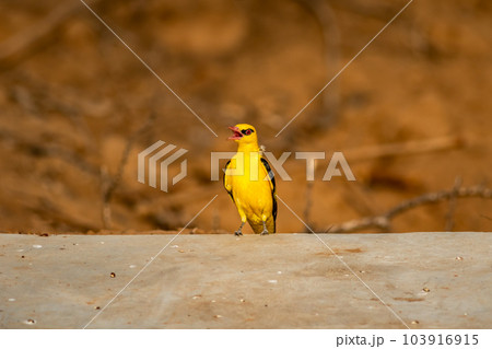 Indian golden oriole or Oriolus kundoo beautiful yellow color bird in the oriole family calling in forest of central india