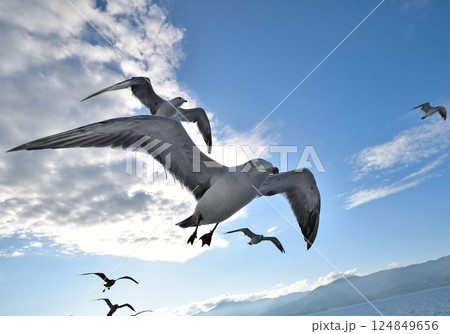 青空を舞うカモメたちの迫力ある飛翔シーン