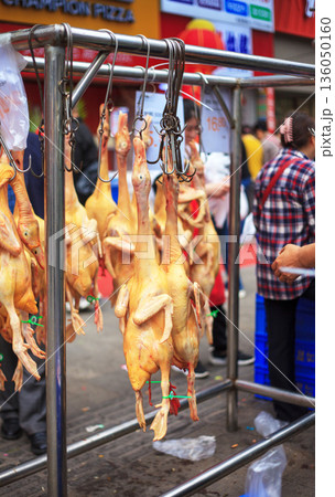 A man is hanging chickens on a metal rack
