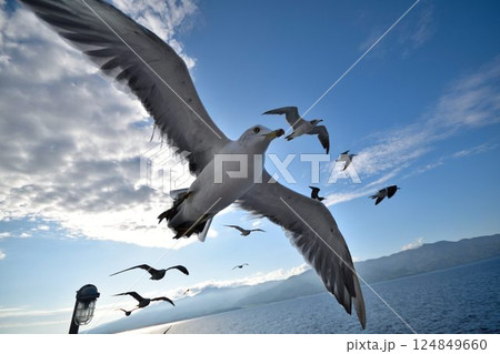 青空を舞うカモメたちの迫力ある飛翔シーン