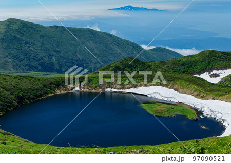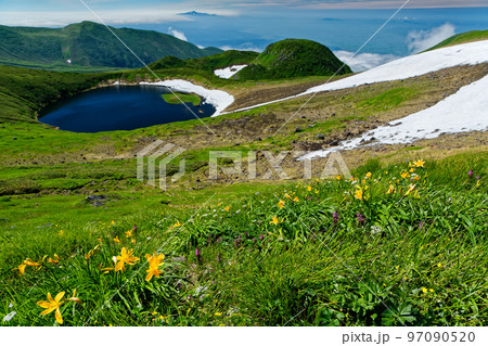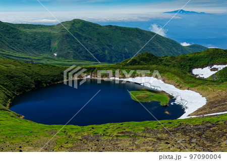 夏の岩木山 残雪残るカルデラの鳥ノ海