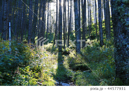 南アルプス塩見岳 山頂への道 鳥倉ルート 朝陽がこぼれるカラマツ帯