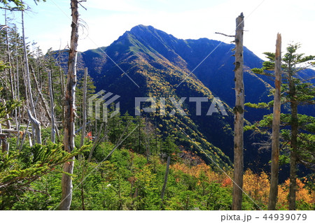 南アルプス塩見岳山頂への道 秋 登山道から見下ろす紅葉の谷