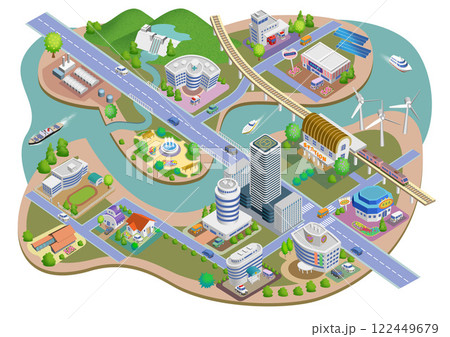 変化を続ける未来都市開発のスマートシティイラスト、3Dアートワーク