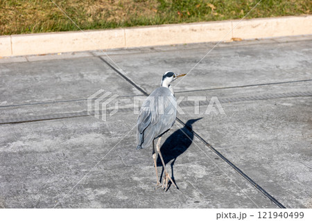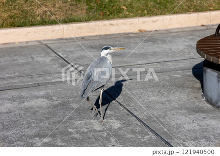 噴水で水を飲んでいるアオサギの姿(東京都足立区の舎人公園)