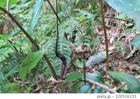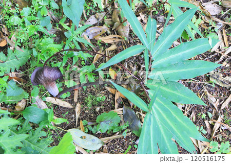 山野の木陰で紫褐色の仏炎苞の怪しげな植物ウラシマソウ