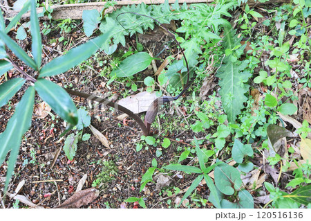 山野で紫褐色の仏炎苞の怪しげな植物ウラシマソウ