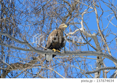 枝に止まるオジロワシの成鳥(北海道・知床)