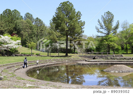 2021日本で一番幸せな町に選ばれた埼玉県鳩山町の桜と緑が綺麗な農村公園水辺広場で遊ぶ幼児とお母さん