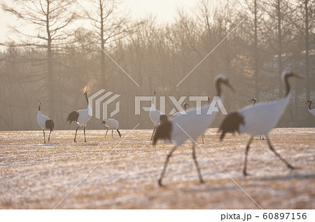 給餌場で早朝に鳴きかわす丹頂鶴(北海道・鶴居)