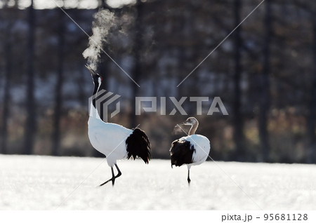 厳寒の北海道鶴居村伊藤サンクチュアリで白い息を吐きながら鳴きかわすつがいのタンチョウ