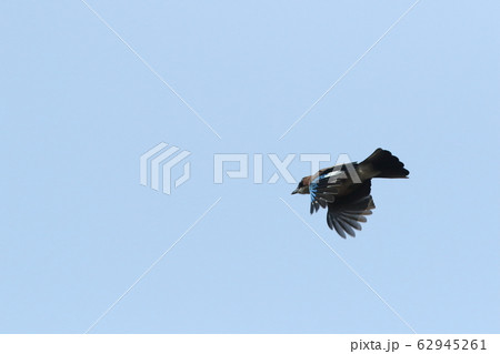 生き物 鳥類 カケス、羽ばたき。きれいな青色の斑点のある羽根が見えます