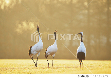 早朝に鳴き交わすタンチョウ(北海道・鶴居)