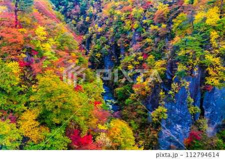 宮城県大崎市 初秋の鳴子峡 荒々しい奇岩の岩肌と鮮やかに色づく紅葉