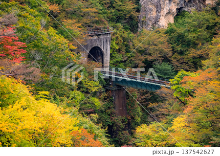 宮城県大崎市 色鮮やかな鳴子峡の紅葉と陸羽東線の鉄橋・トンネル