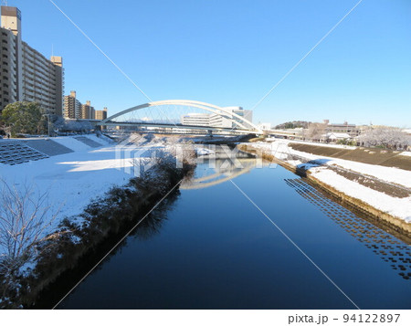 雪景色 鶴見川 鴨池大橋
