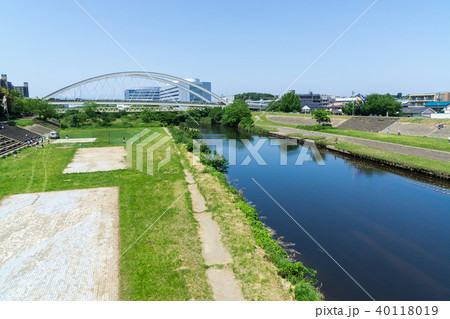 鶴見川・鴨居の風景〜鴨池人道橋と鴨池大橋(空撮) - 神奈川県横浜市,日本