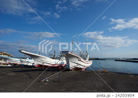 房総鴨川の漁港に繋留された漁船と青空