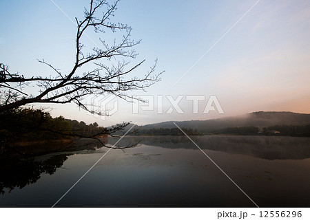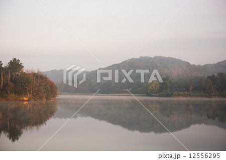 朝もやと鴨池
