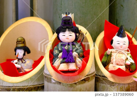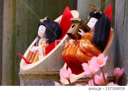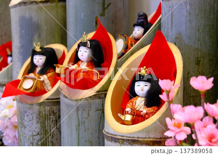 竹飾りの雛人形と桃の花 春の訪れを感じる和の風景