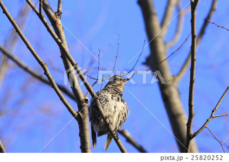 青空が広がる荒川の川原の木の枝に止まっているツグミ