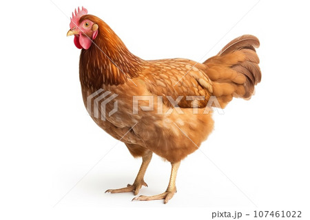 Brown chicken standing on white background, looking at camera with bright eyes.