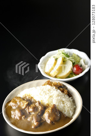 大きな鶏肉がゴロゴロと入っている熱々チキンカレーとじゃがいもサラダ