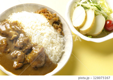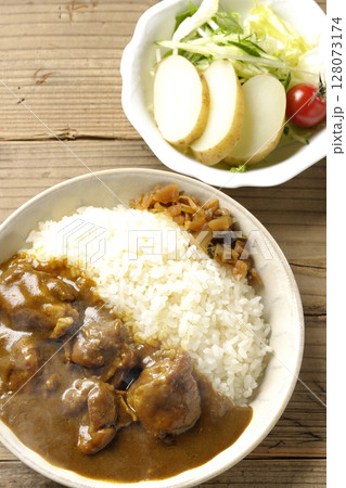大きな鶏肉がゴロゴロと入っているチキンカレーとじゃがいもサラダ