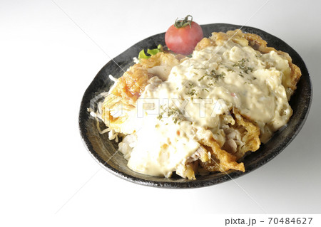 ミニトマトなど野菜も一緒に乗っているタルタルソースたっぷりの熱々チキン南蛮丼(白背景)
