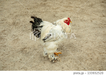 Rooster with white and black feathers on sandy soil