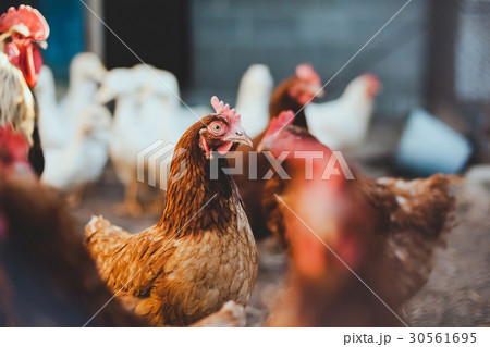 chicken on a farm nearby cock and ducks