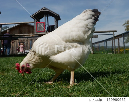 White chicken is eating grass in a field