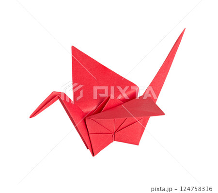Origami paper crane, red tsuru, made of folding paper. Most classic Japanese origami design used for decoration, as present, and as peace symbol. It is believed crane wings carry souls up to paradise.