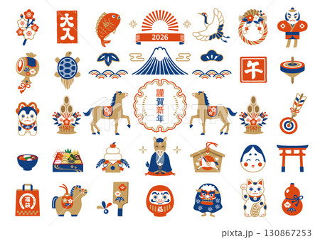 2026年 午年 和風フレームとお正月の縁起物イラストセット