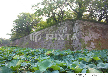 城壁とお堀と蓮の葉と(鹿児島県鶴丸城)