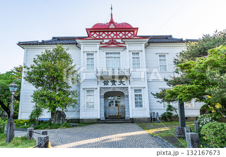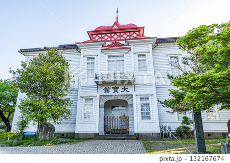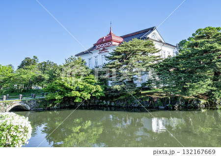 山形県鶴岡市鶴ケ岡城跡公園に建つ外堀の橋から見た大寶館 正面