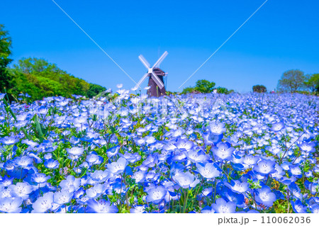 風車とネモフィラの花