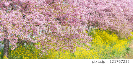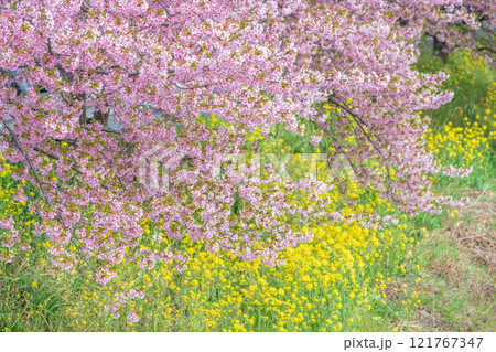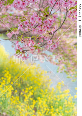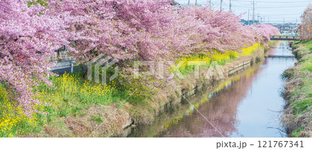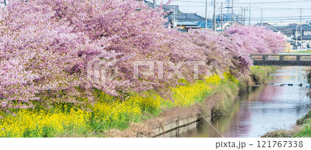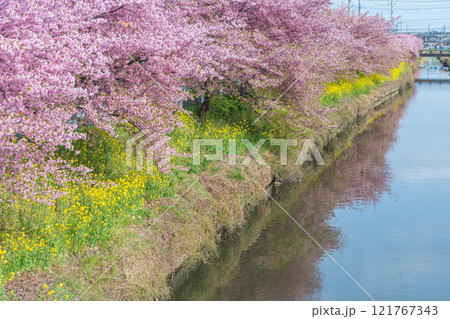 「埼玉県」青毛堀川に咲く満開の河津桜並木と菜の花・久喜市