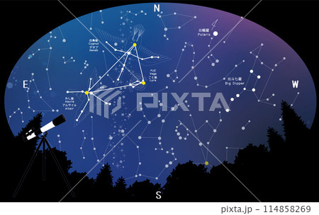 夜空を背景に浮かぶ夏の大三角のイラスト(白鳥・鷲・竪琴の絵あり)